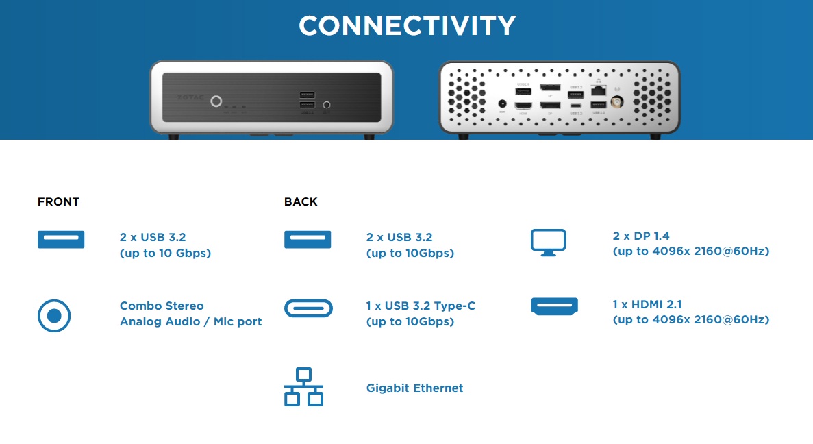 Zotac отмечает наличие у нового ПК Wi-Fi 6, Bluetooth 5.2, четырёх портов USB 3.2, HDMI 2.1, USB-C 3.2, пары DisplayPort 1.4, двух слотов для памяти DDR5, двух слотов для SSD формата M.2 и объём корпуса 1,79 литра.